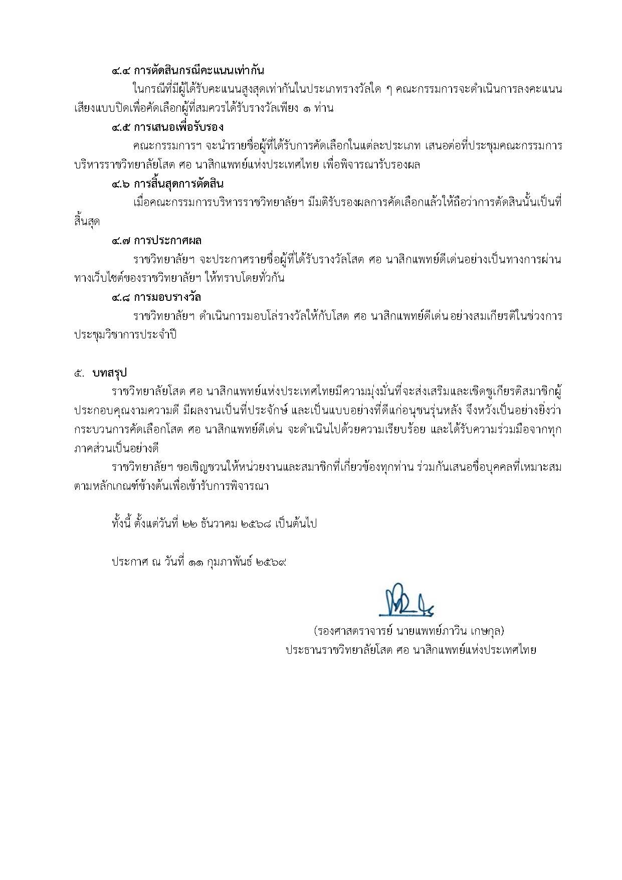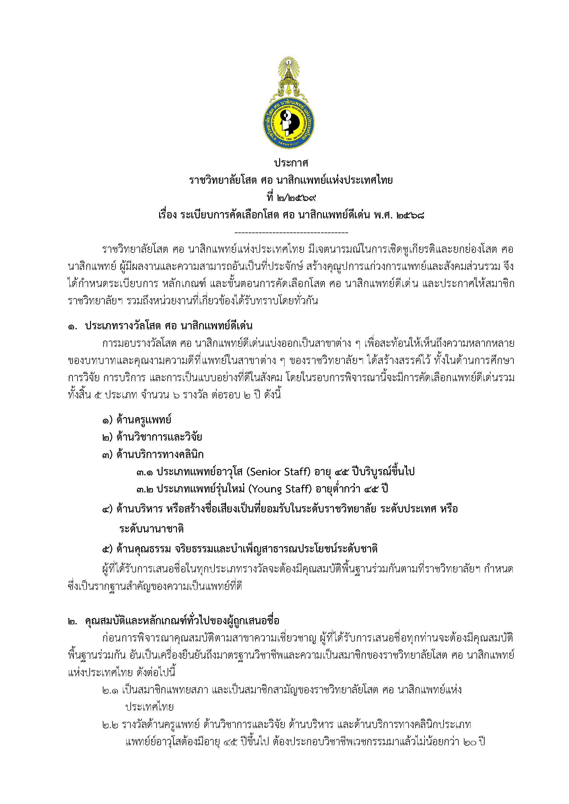 ประกาศราชวิทยาลัยโสตฯ ที่ 2/2569 เรื่อง ระเบียบการคัดเลือกโสต ศอ นาสิกแพทย์ดีเด่น พ.ศ. 2568