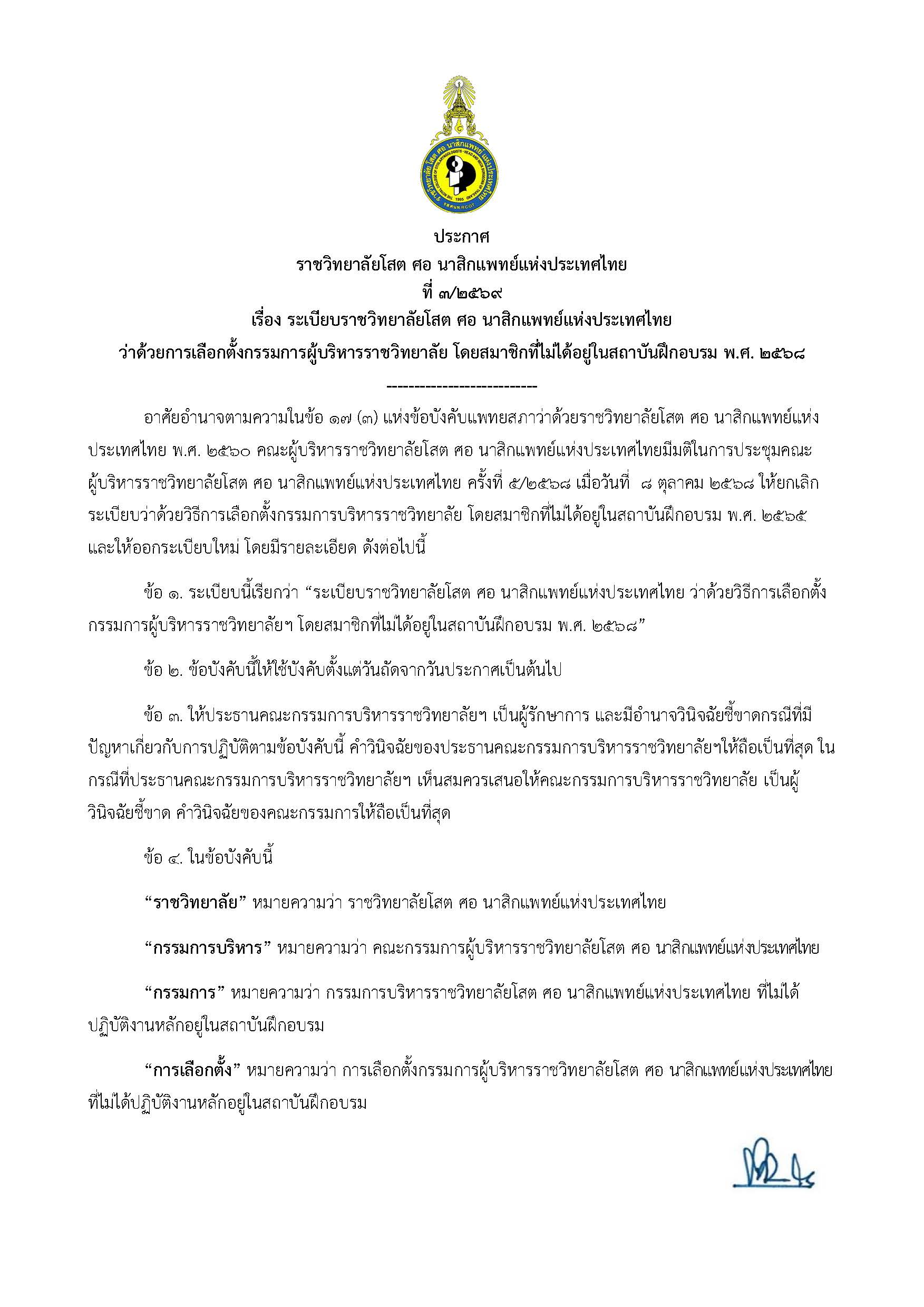 ประกาศราชวิทยาลัยโสตฯ ที่ 3/2569 ประกาศ เรื่อง ระเบียบราชวิทยาลัยโสต ศอ นาสิกแพทย์แห่งประเทศไทย ว่าด้วยการเลือกตั้งกรรมการผู้บริหารราชวิทยาลัย โดยสมาชิกที่ไม่ได้อยู่ในสถาบันฝึกอบรม พ.ศ. 2568