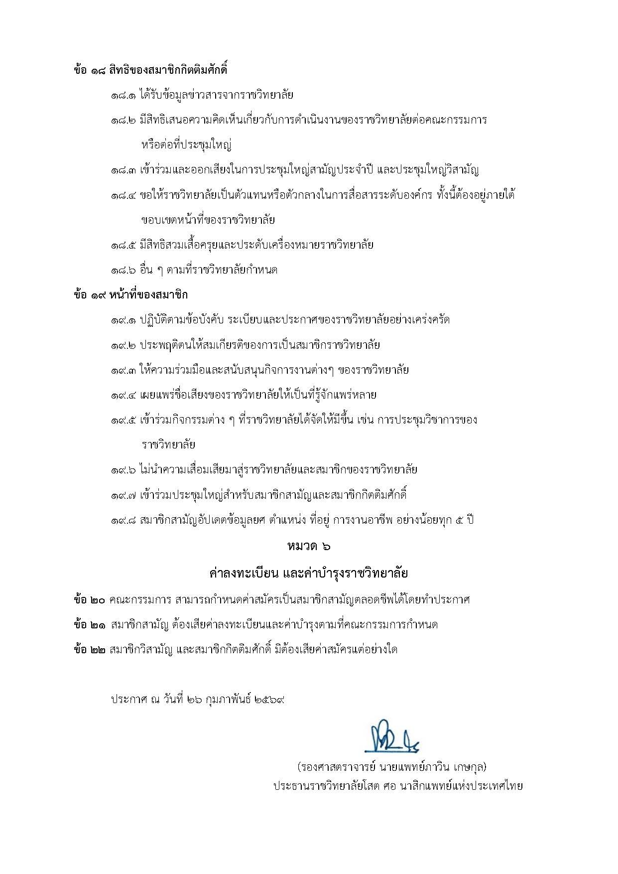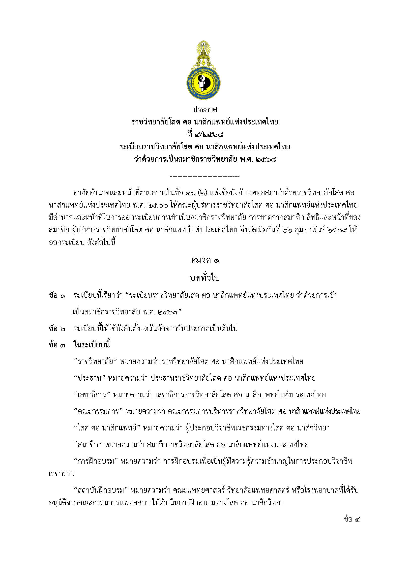 ประกาศราชวิทยาลัยโสตฯ ที่ 4/2569 ระเบียบราชวิทยาลัยโสต ศอ นาสิกแพทย์แห่งประเทศไทย ว่าด้วยการเป็นสมาชิกราชวิทยาลัย พ.ศ. 2568