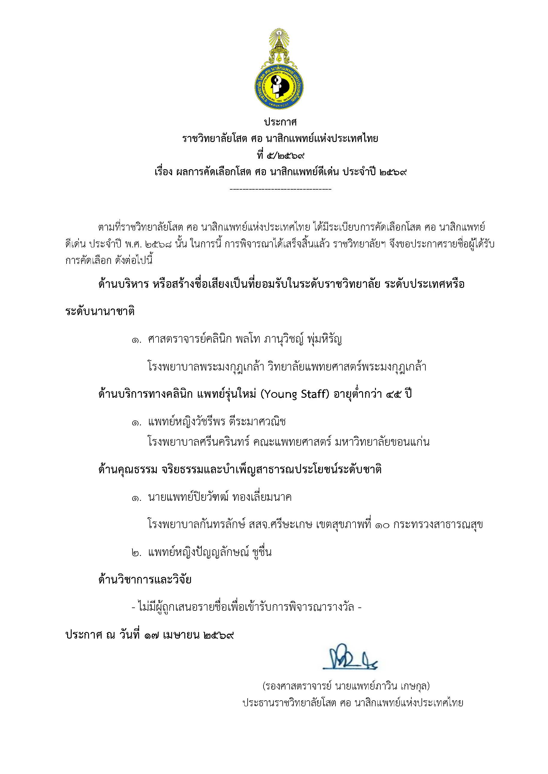 ประกาศราชวิทยาลัยโสตฯ ที่ 5/2569 เรื่อง ผลการคัดเลือกโสต ศอ นาสิกแพทย์ดีเด่น ประจำปี 2569