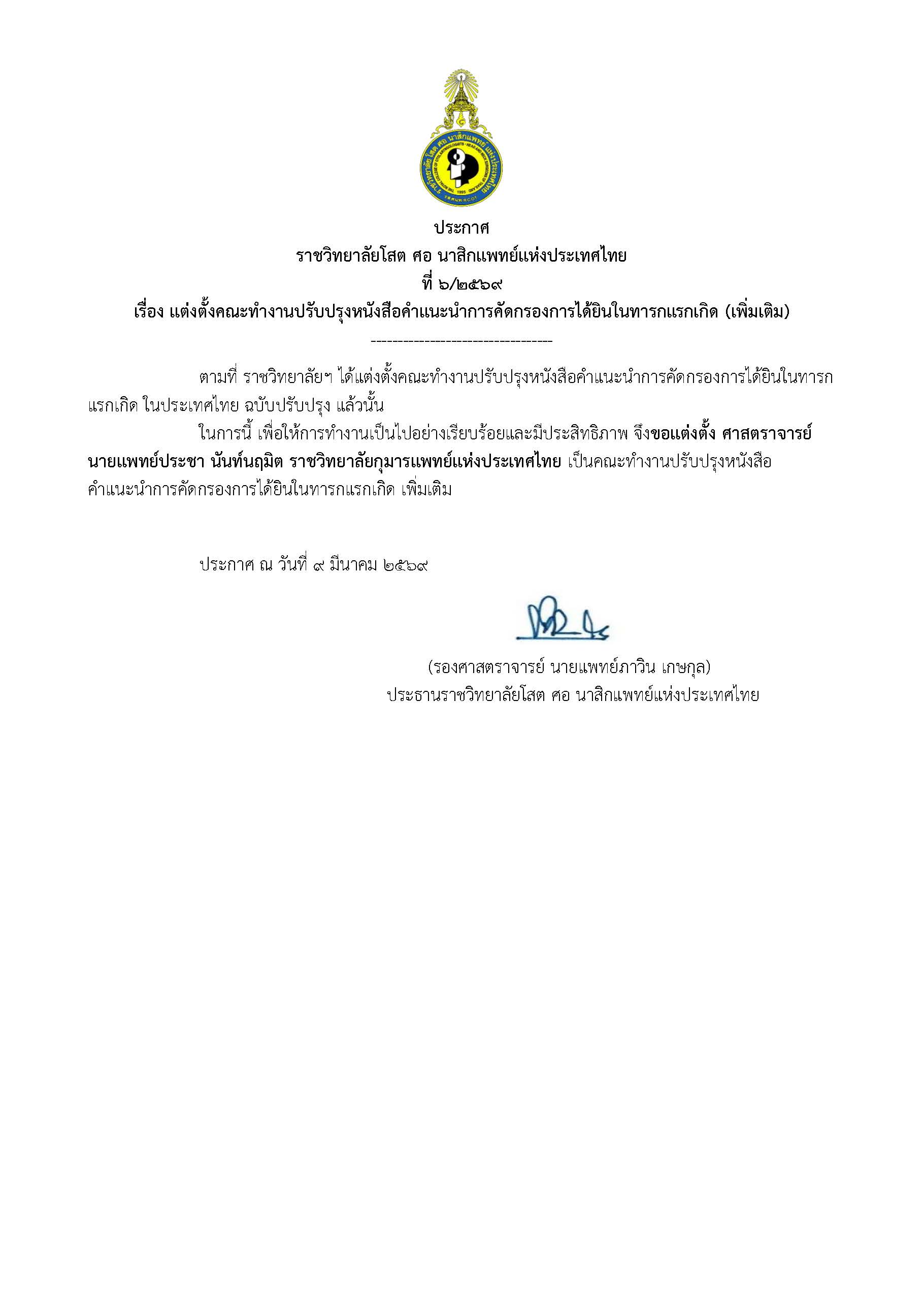 ประกาศราชวิทยาลัยโสตฯ ที่ 6/2569 เรื่อง แต่งตั้งคณะทำงานปรับปรุงหนังสือคำแนะนำการคัดกรองการได้ยินในทารกแรกเกิด (เพิ่มเติม)