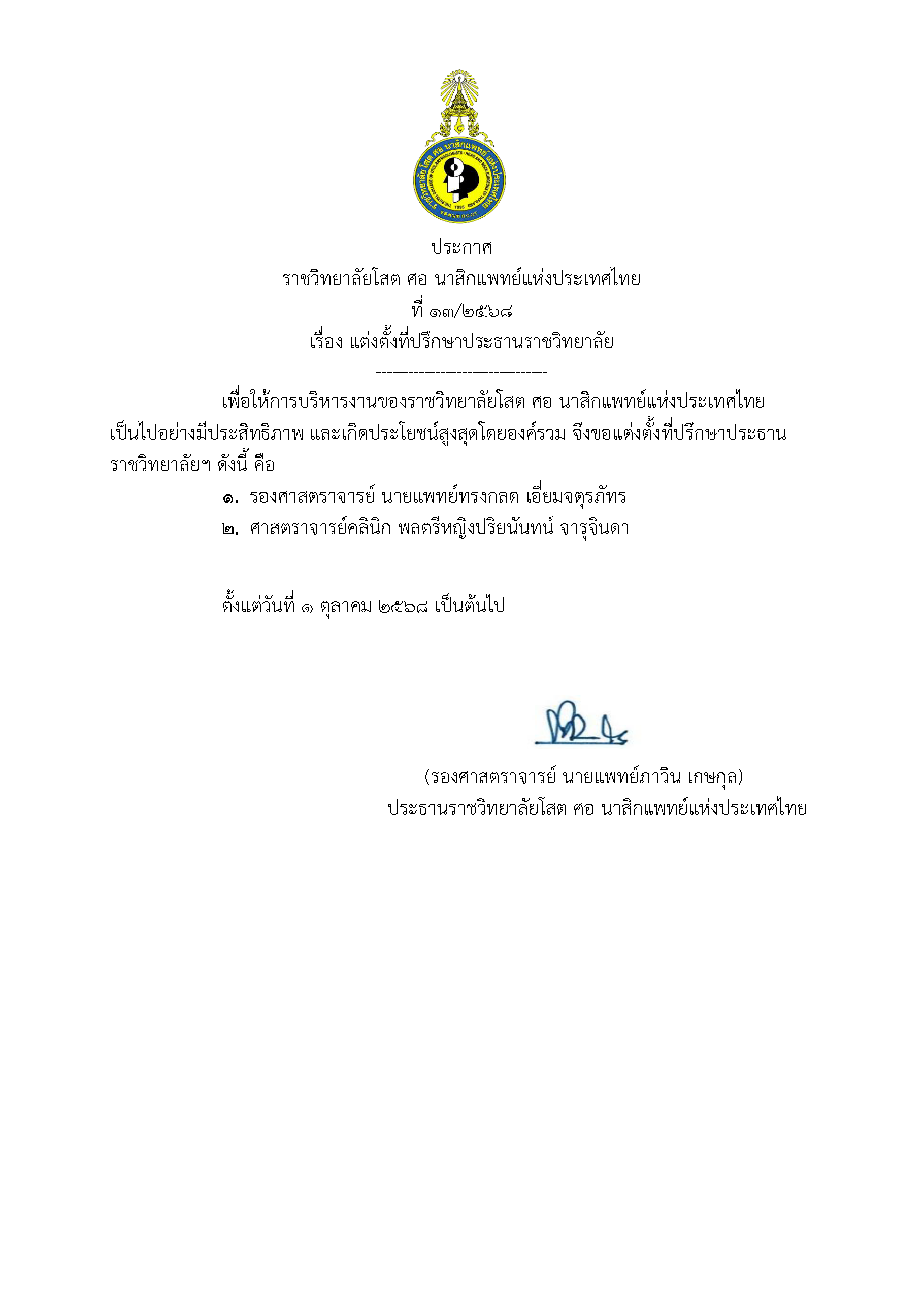 ประกาศราชวิทยาลัยโสต ศอ นาสิกแพทย์แห่งประเทศไทย ที่ 13/2568 เรื่อง แต่งตั้งที่ปรึกษาประธานราชวิทยาลัย