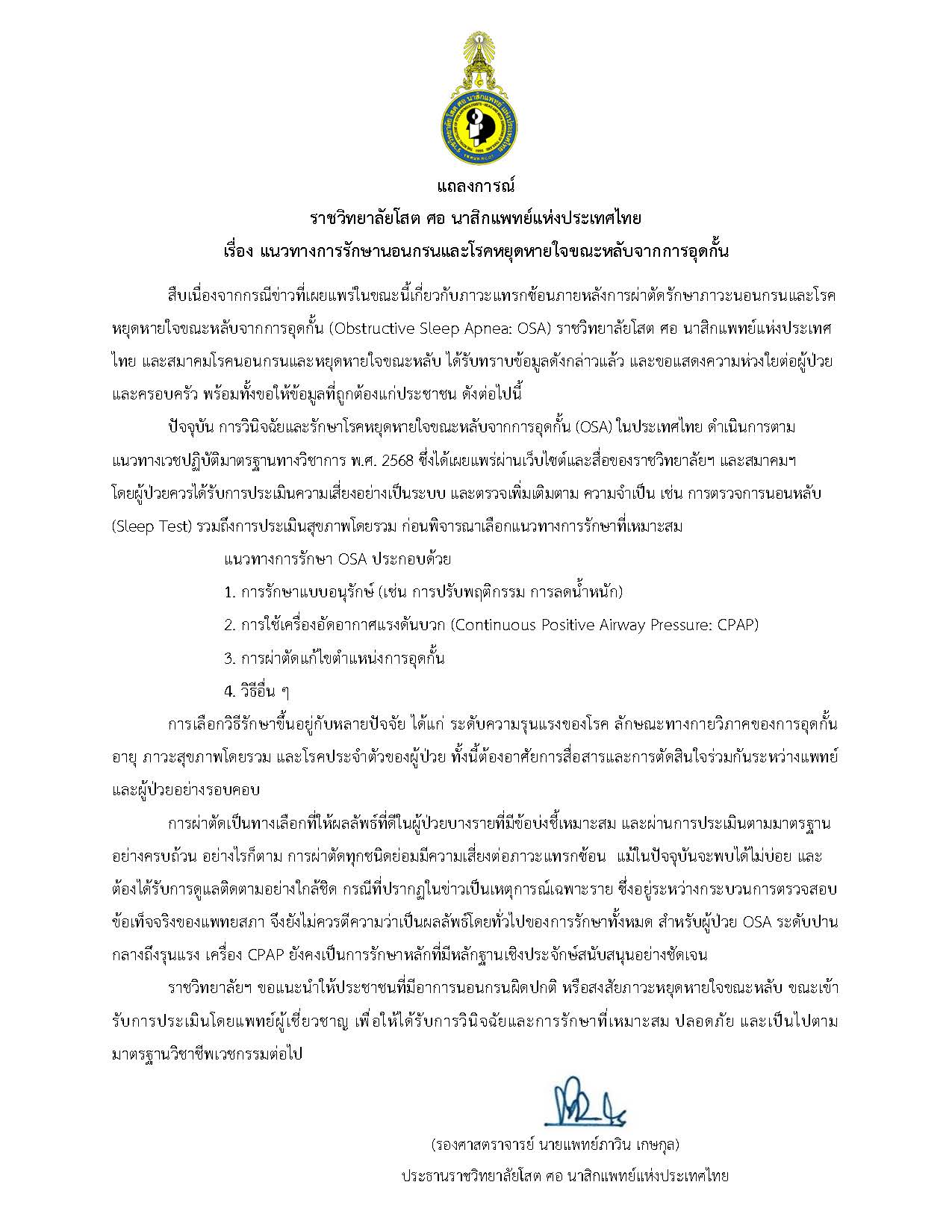 แถลงการณ์ ราชวิทยาลัยโสต ศอ นาสิกแพทย์แห่งประเทศไทย เรื่อง แนวทางการรักษานอนกรนและโรคหยุดหายใจขณะหลับจากการอุดกั้น