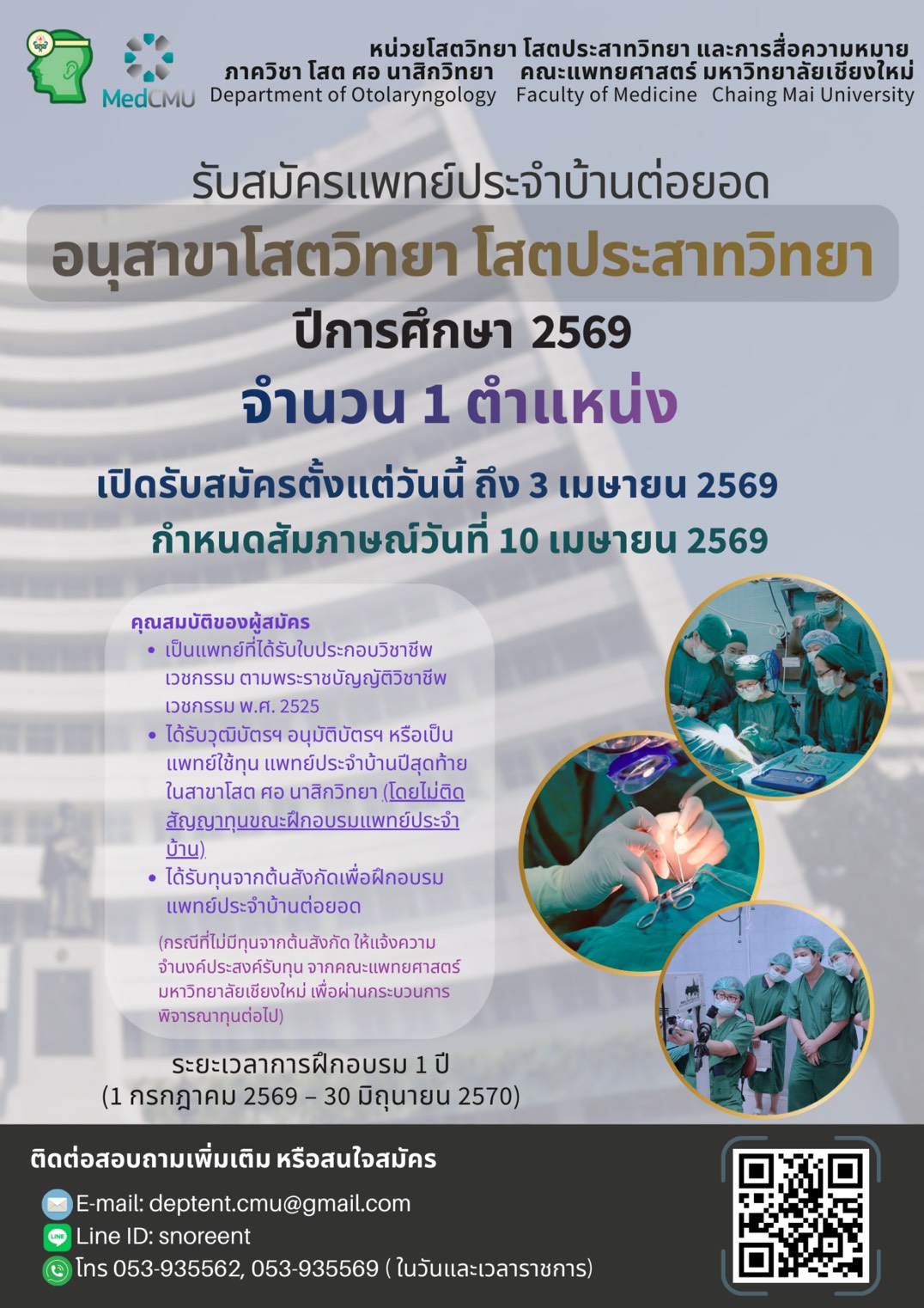 หน่วยโสตวิทยา โสตประสาทวิทยา และการสื่อความหมายฯ คณะแพทยศาสตร์ มหาวิทยาลัยเชียงใหม่ รับสมัครแพทย์ประจำบ้านต่อยอด อนุสาขาโสตวิทยา โสตประสาทวิทยา ปีการศึกษา 2569