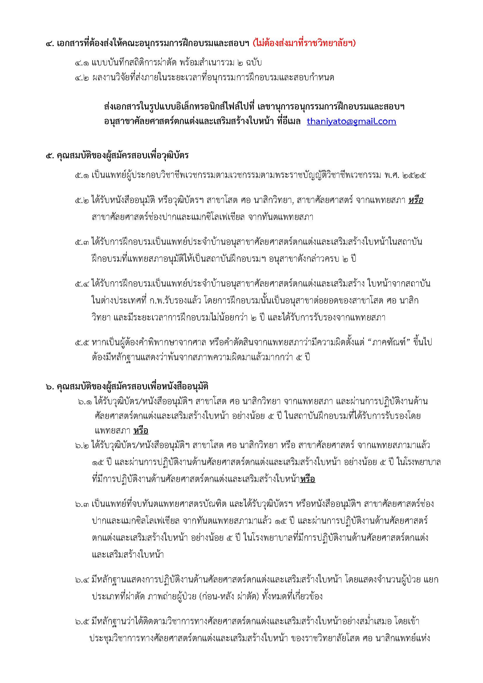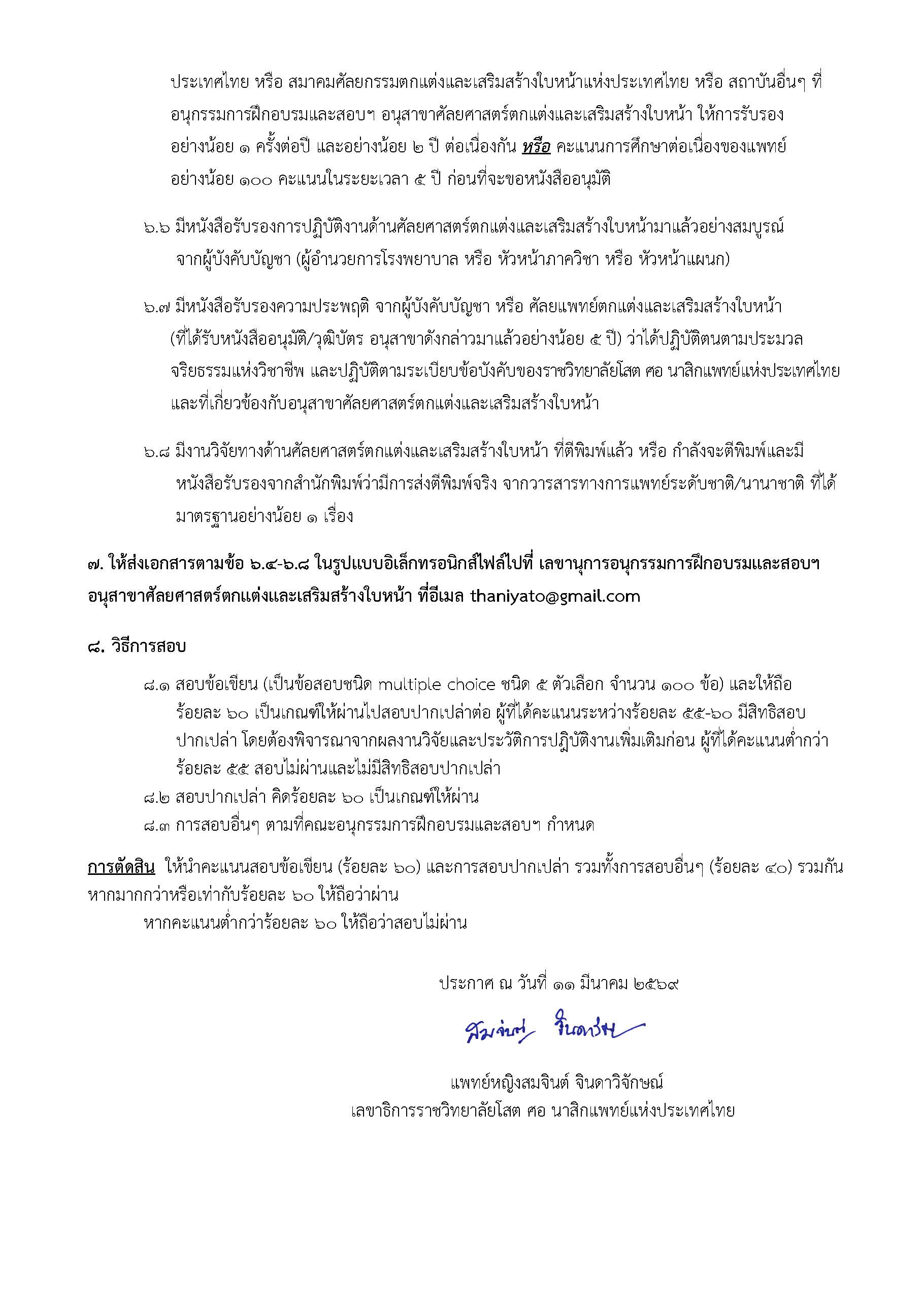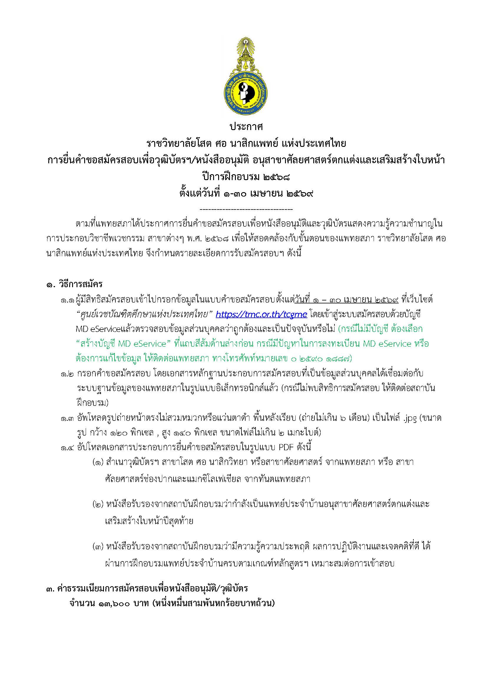ประกาศราชวิทยาลัยโสต ศอ นาสิกแพทย์แห่งประเทศไทย การยื่นคำขอสมัครสอบเพื่อวุฒิบัตรฯ/หนังสืออนุมัติ แสดงความรู้ความชำนาญฯ อนุสาขาศัลยศาสตร์ตกแต่งและเสริมสร้างใบหน้า ปีการฝึกอบรม 2568 ตั้งแต่วันที่ 1 - 30 เมษายน 2569