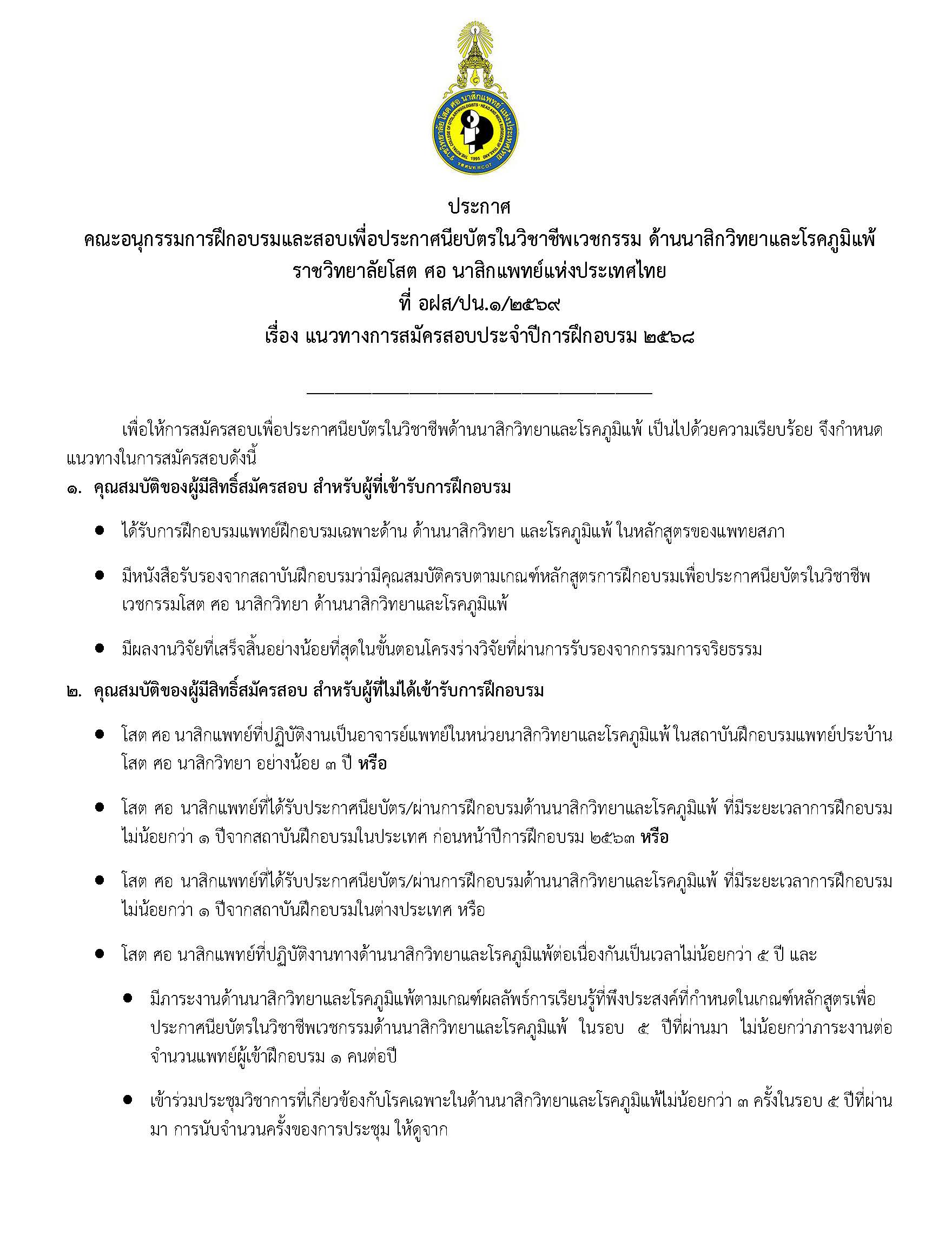 ประกาศ คณะอนุกรรมการฝึกอบรมและสอบเพื่อประกาศนียบัตรในวิชาชีพเวชกรรม ด้านนาสิกวิทยาและโรคภูมิแพ้ ราชวิทยาลัยโสต ศอ นาสิกแพทย์แห่งประเทศไทย ที่ อฝส/ปน.1/2569 เรื่อง แนวทางการสมัครสอบประจำปีการฝึกอบรม 2568