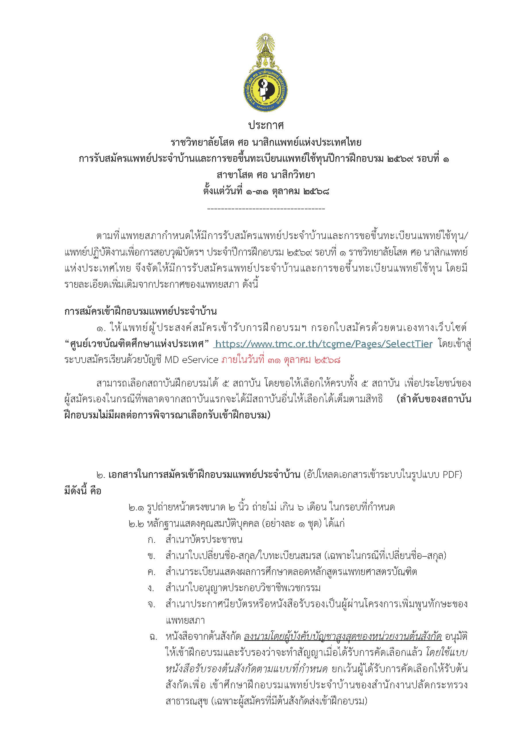 ประกาศการรับสมัครแพทย์ประจำบ้านและการขอขึ้นทะเบียนแพทย์ใช้ทุนปีการฝึกอบรม 2569 รอบที่ 1